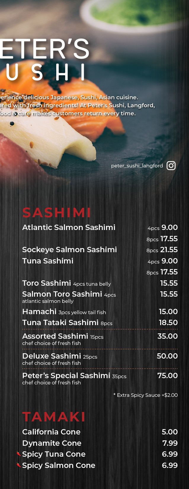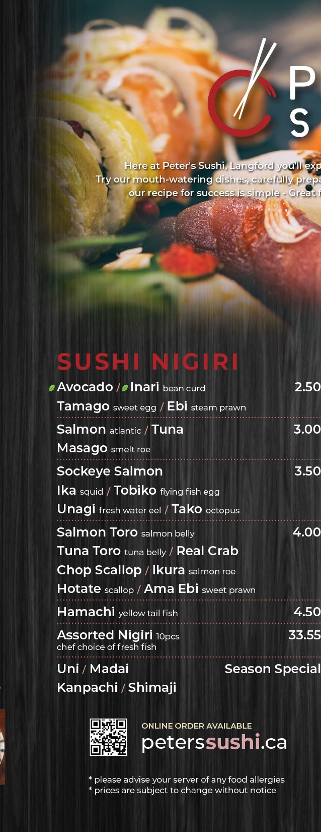 Order Online for Takeout / Pickup. Here at Peter's Sushi, Langford you'll experience delicious Japanese, Sushi, Asian cuisine. Try our mouth-watering dishes, carefully prepared with fresh ingredients! At Peter's Sushi, Langford, our recipe for success is simple - Great food & care makes customers return every time.